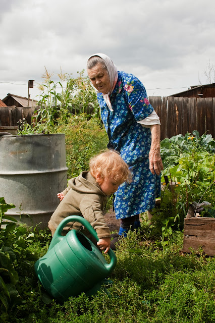 В гостях у бабы «Ули» Гриша занялся своим привычным делом: поливал огород. Баба «Стара» ему помогала.